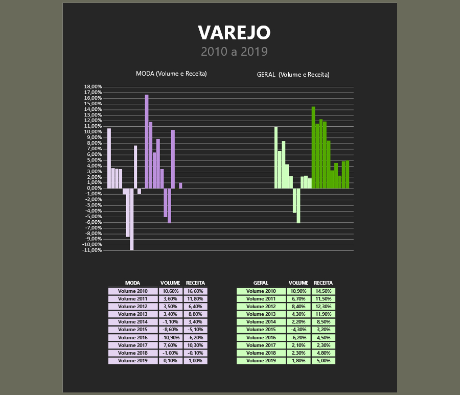 Na tabela abaixo, elaborada pelo GBLjeans, confira a variação de volume de vendas e receita nominal do varejo de moda em relação ao comércio em geral entre 2010 e 2019.